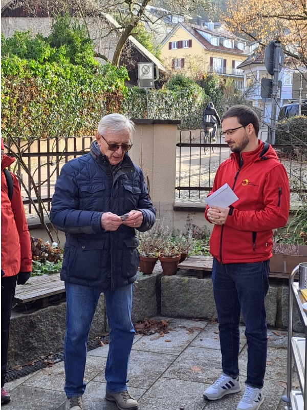 Die 2-Stunden-Wandergruppe des Schwarzwaldvereins Staufen-Bad Krozingen e. V. übergibt 600 Euro an die Tagespflege im Alten Spital Staufen.