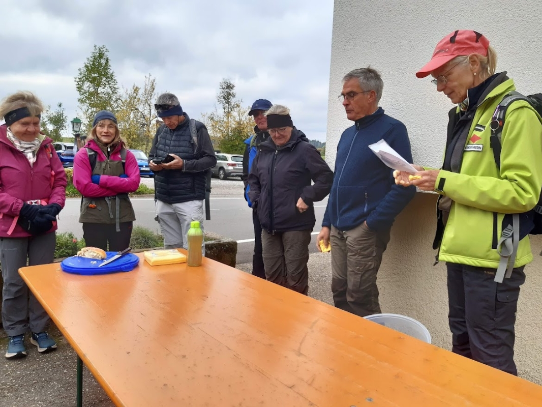 Am Dienstag, den 14.10.25 fuhren wir in Fahrgemeinschaften in Richtung Hornberg nach Fohrenbühl. Angekommen am Ausgangspunkt Landgasthof Schwanen, erwartete uns eine feine Überraschung. Gerhard Rink verteilte zur Stärkung einen hausgemachtem Hefezopf vor unserem Hotel.